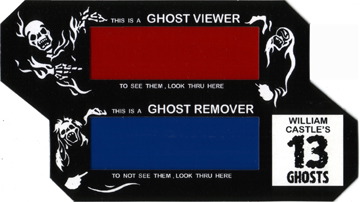 The DVD only came with one of these ghost viewers, which is kind of a drag if you were hoping to watch the movie with somebody. (Apparently at some point the DVD no longer came with a viewer at all. And according to Home Theater Forum, Sony's latest reissue of the DVD only presents the black-and-white version without Illusion-O!)